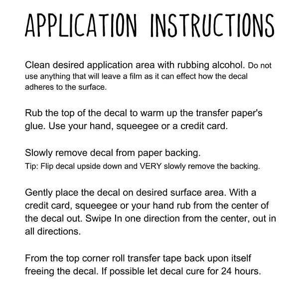 You can apply your decal to any hard smooth surface such as vehicles, laptops, windows, doors, mugs, mirrors, or incorporate into crafts to make some fun diy decor.